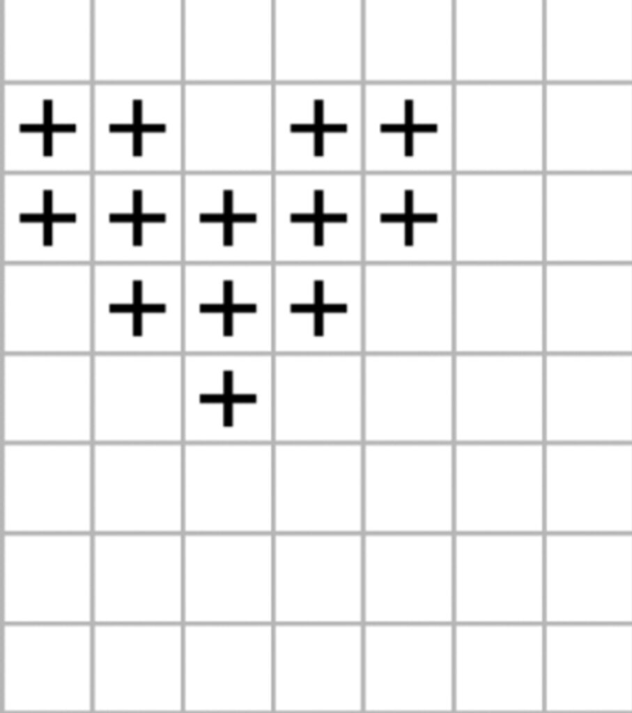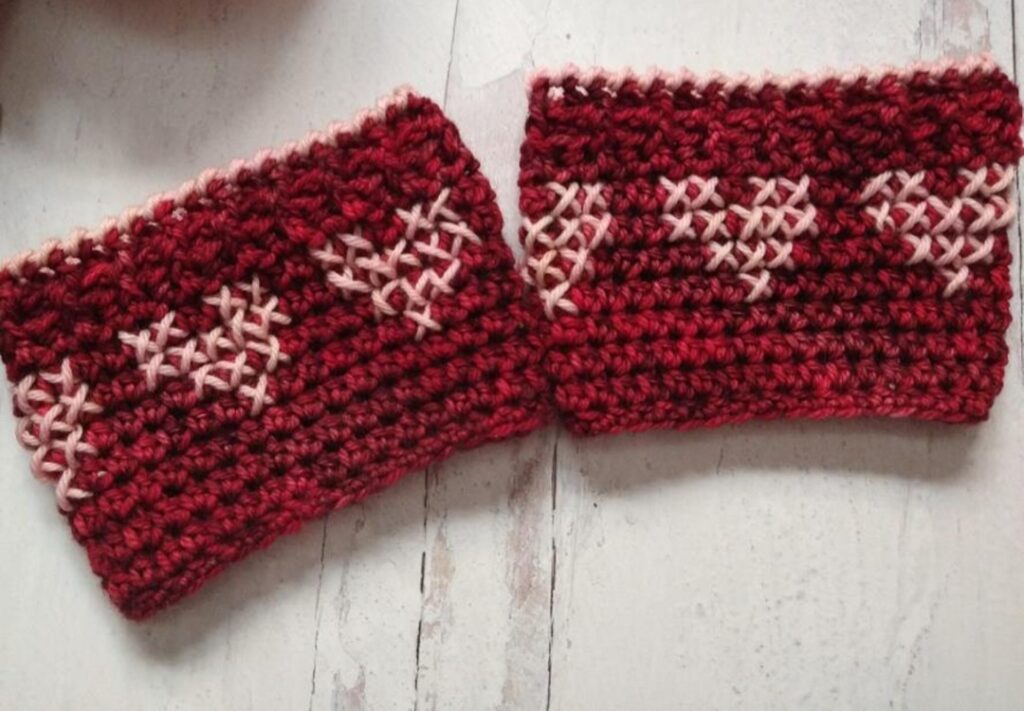 Using contrasting yarn and tapestry needle, cross stitch heart around the boot cuff, using the chart and photos below. The cross stitches will only be on the hdc rows.