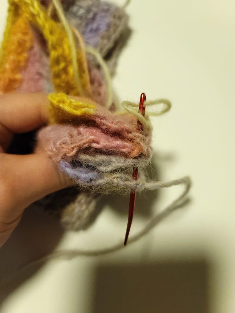 Row 4-9: Repeat row 2 and 3. Fasten off, leaving a tail measuring 25 to 30 inches. Lay piece flat. Fold both ends and put one side of fold in the middle of the other side’s fold, as pictured. Using tail, sew across piece, making sure to go through all 4 edges. Fasten off and sew in ends.