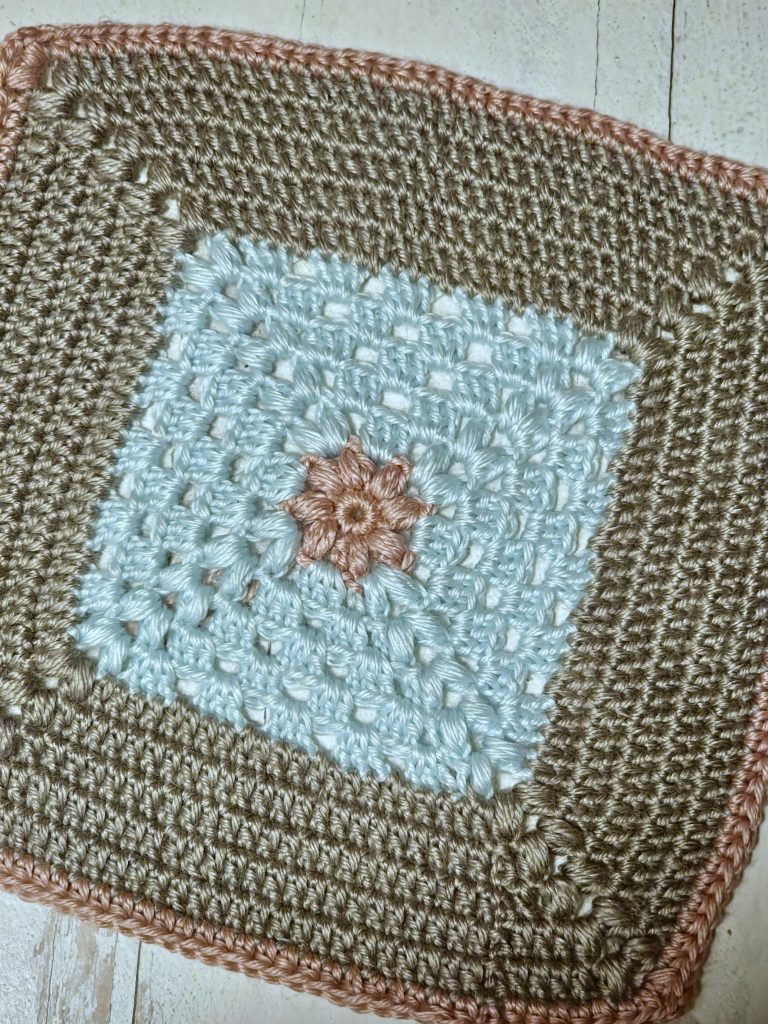 Furls Wander yarn in Aurora (CC1=contrast color 1), Mist (CC2= contrast color 2) and Tundra (MC= main color)- alternate square is made in Lion Brand Amazing yarn